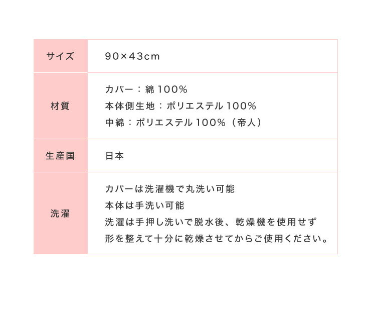 【サイズ】43x90cm【素材】側生地:ポリエステル100%中綿:ポリエステル100%カバー:綿100%【生産国】日本【備考】カバーは洗濯可能【送料について】北海道、沖縄、離島は別途送料を頂きます。