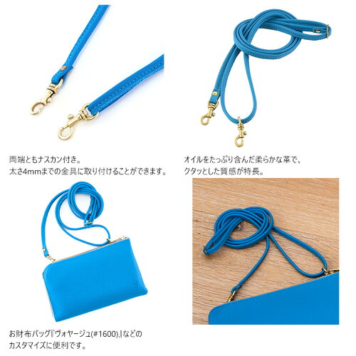 Detail 商品説明 ■素材:牛革 ■サイズ:8mm巾、82〜153cmまで調節可能 ■重量:約40g お財布ポシェット『ボヤージュ』(#1600)などのカスタマイズに便利な、本革製のショルダーストラップです。
